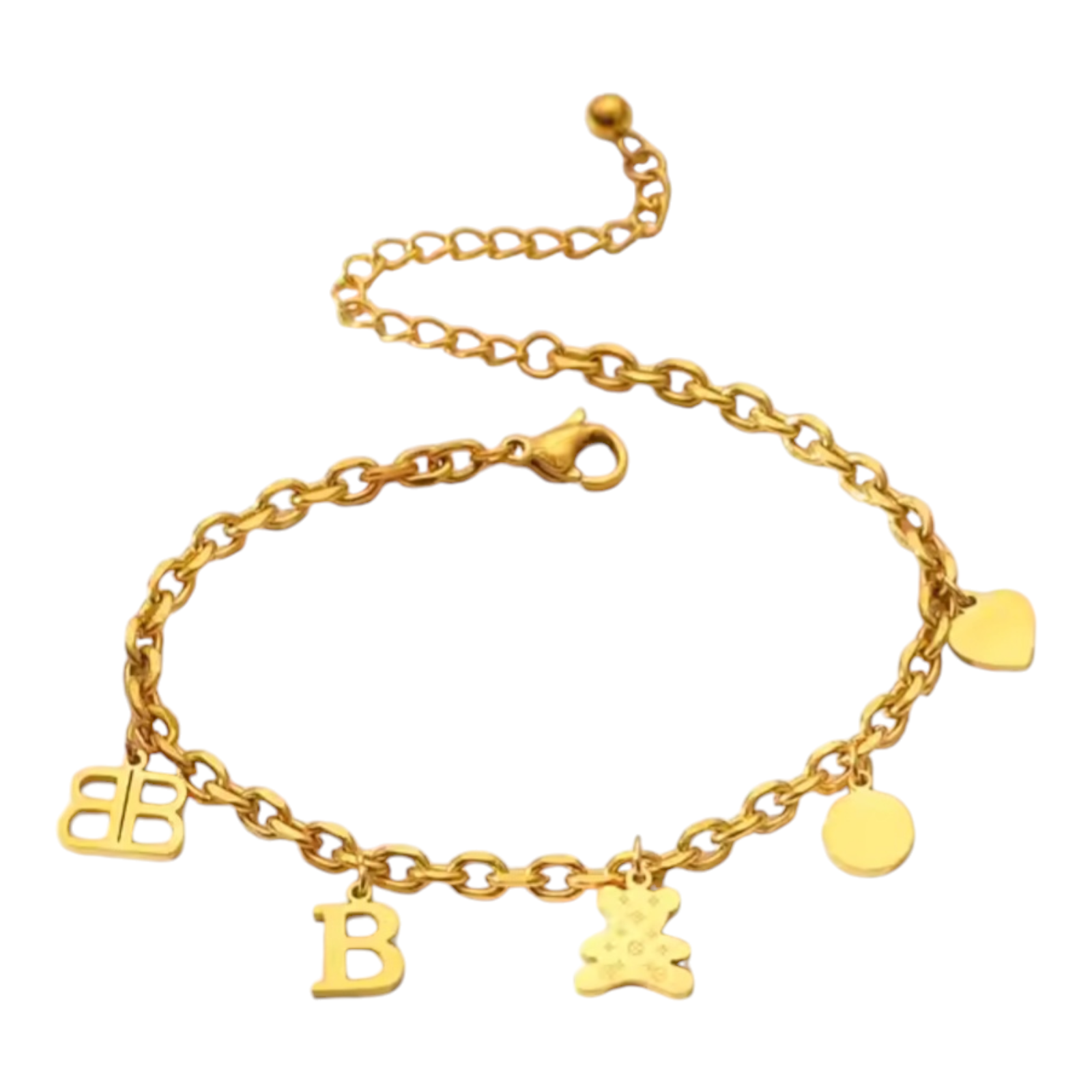 Luxury Balenciaga inspired Titanium and Stainless Steel silver and gold tarnish free bear heart B letter cuff charm bracelet