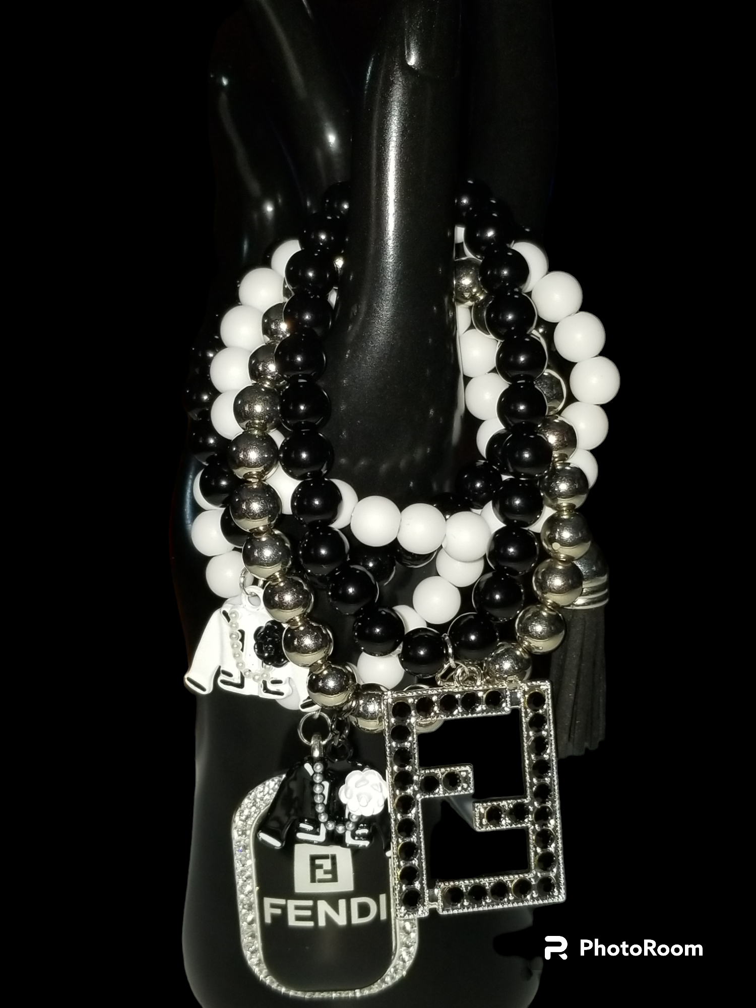 This fashionable designer charm bracelet by AshleyMarieBoutique is a must-have accessory for any occasion. The bracelet is made of 5 stackable beaded bracelets with a slide closure, making it easy to wear and stack with other bracelets.