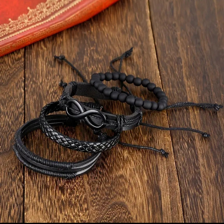 infinity black beeded and braided leather bracelet set