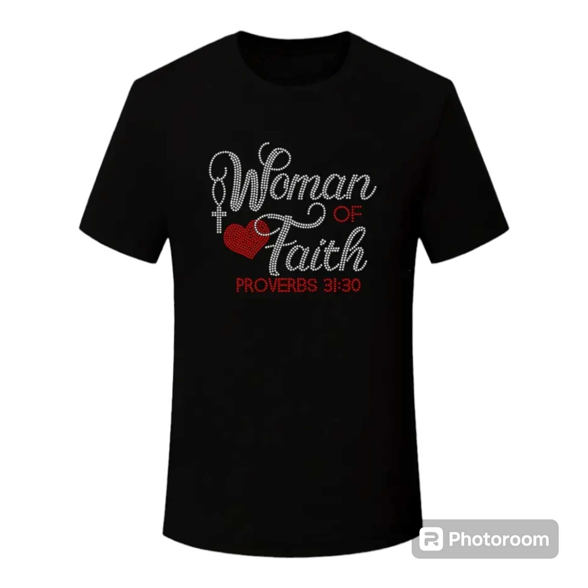 Rhinestones Woman Of Faith Size Crew-neck Black, Red, and Silver Graphic TShirt