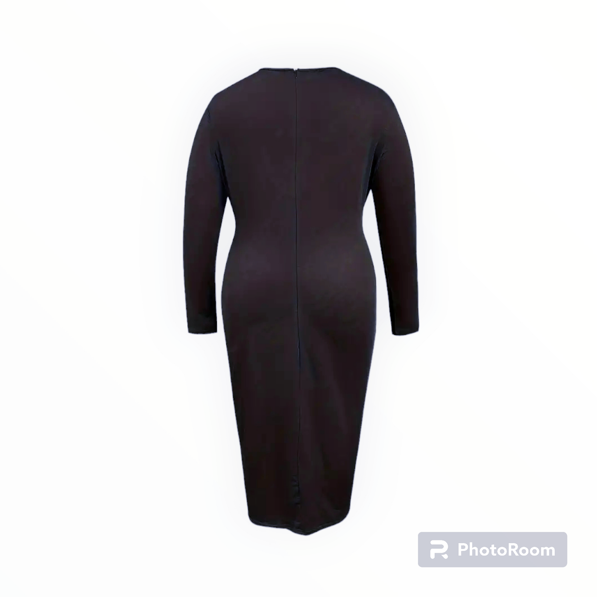Plus size casual black long sleeve, round neck cut out, midi slim fit, and zip back dress.