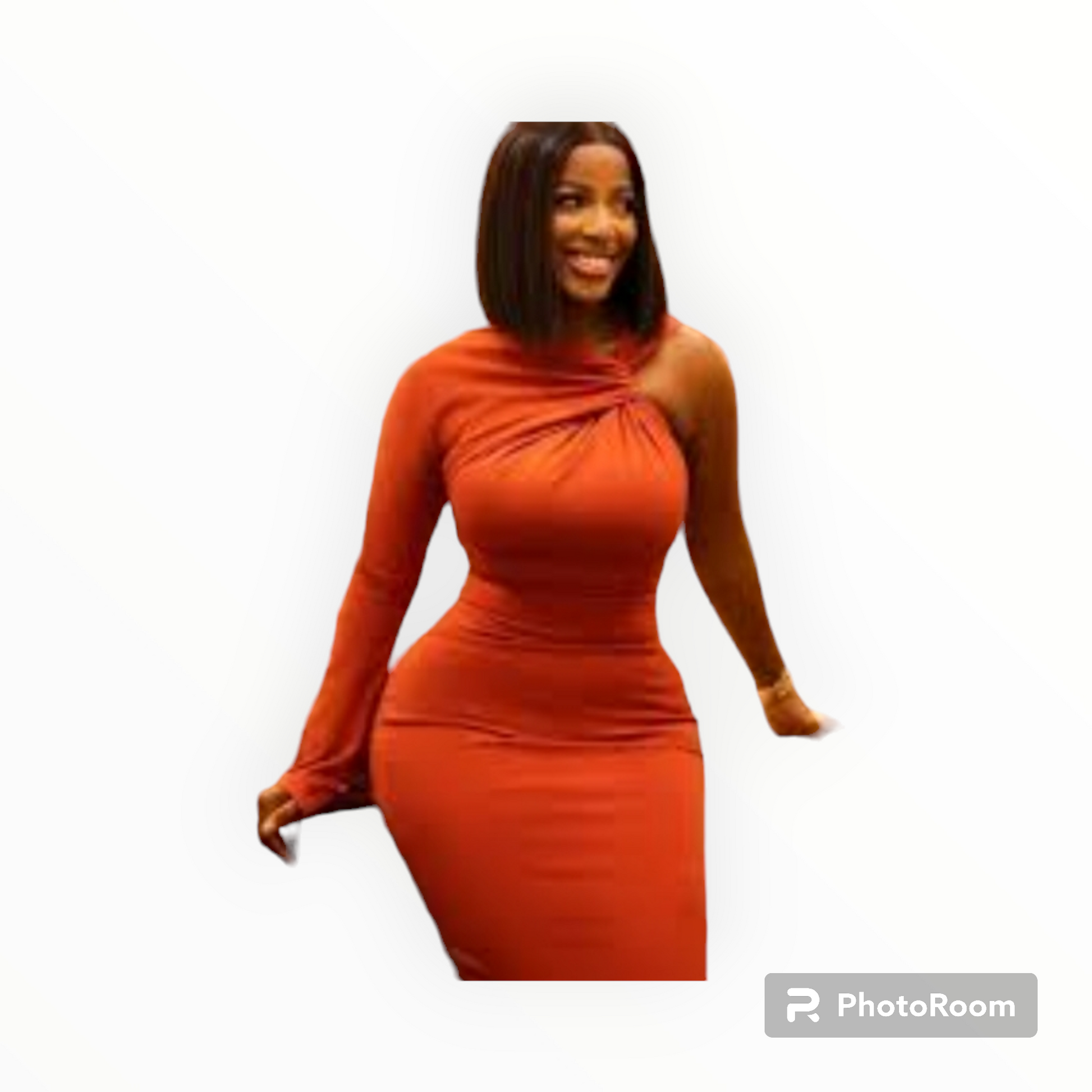 Plus size solid skewed neck one shoulder long sleeve bodycon midi dress. 100% polyester and slight stretch.
