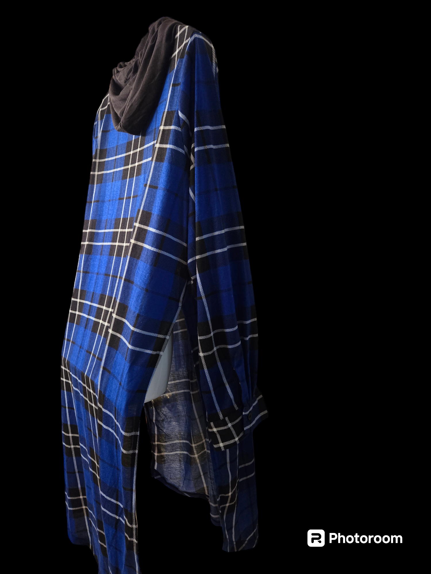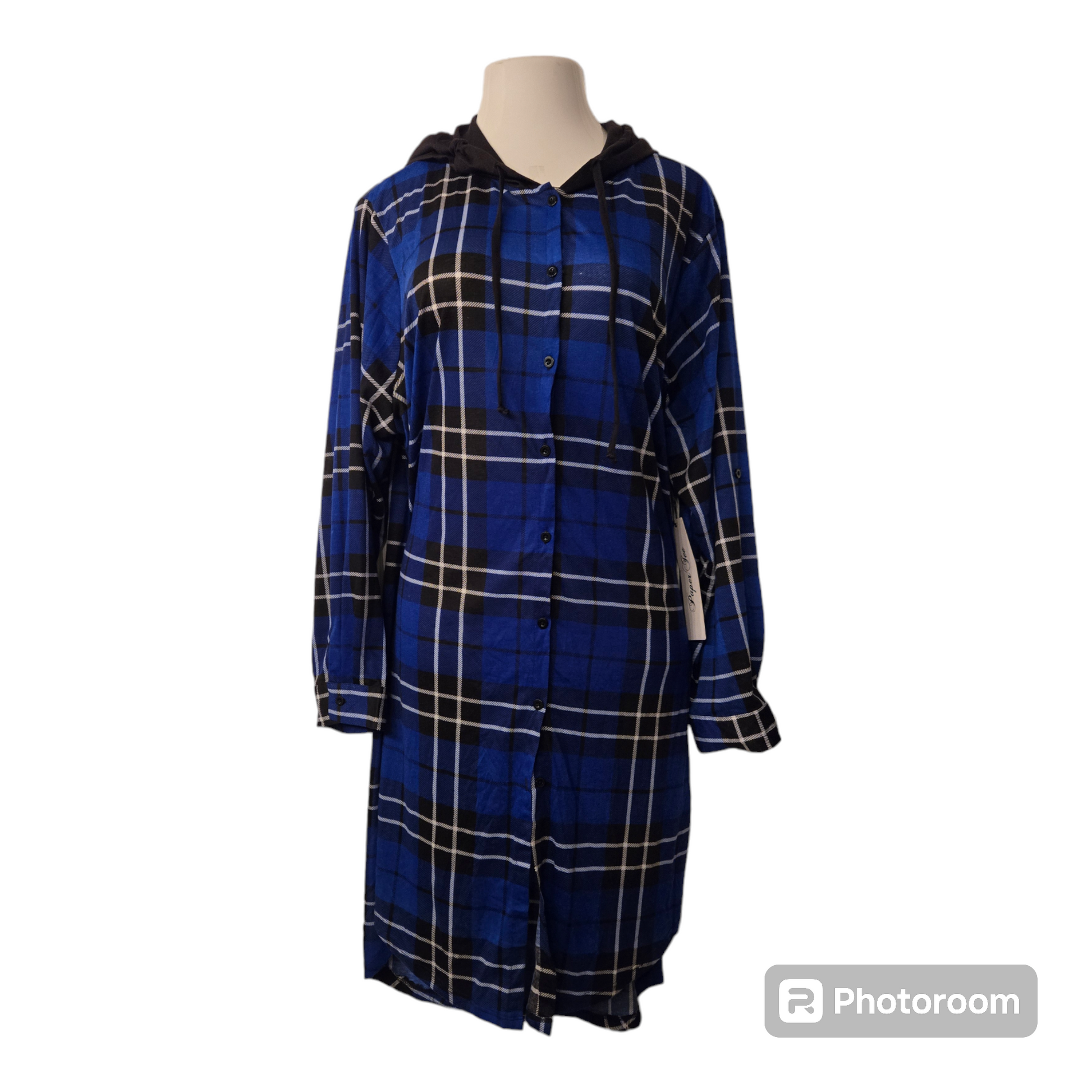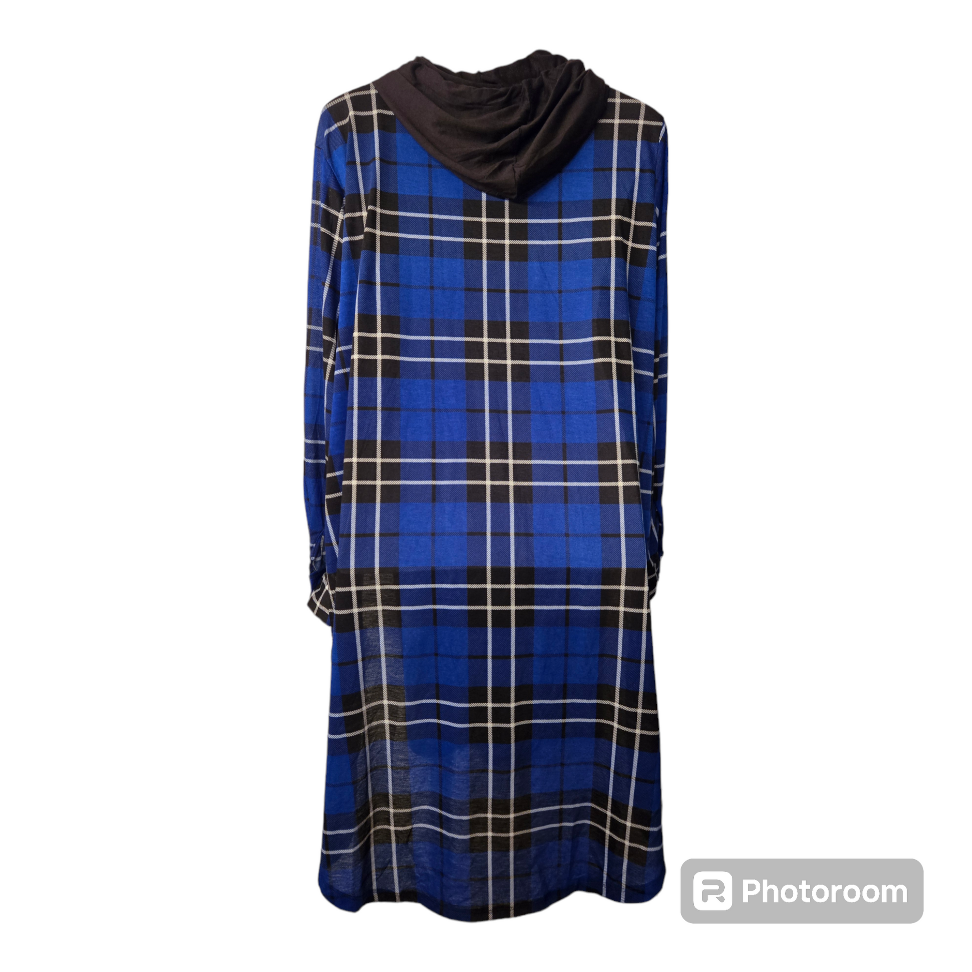Versatile plus size hooded plaid blue and blue shirt dress with size slits. can be worn as a shirt or dress