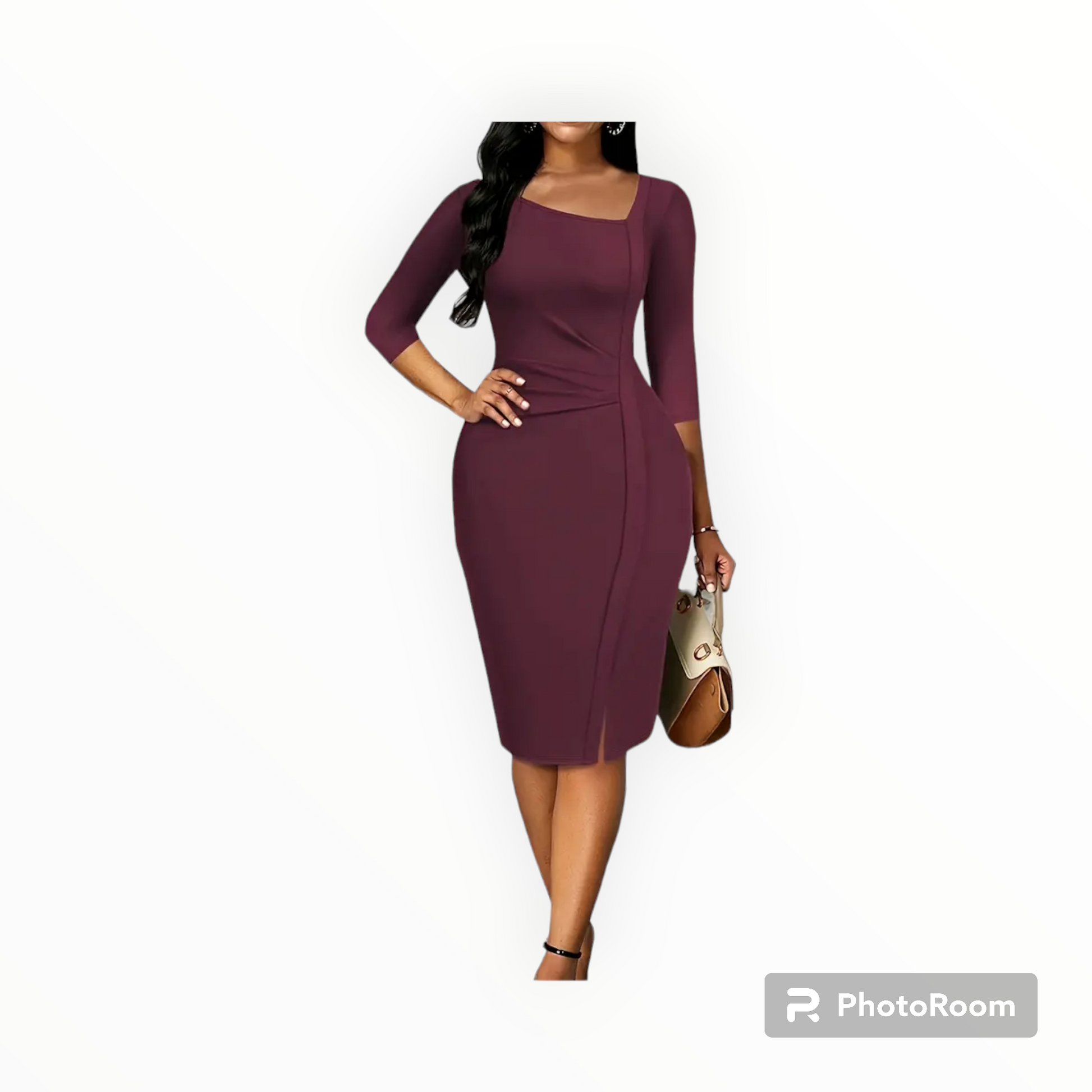 Plus Size burgundy women professional asymmetrical neck midi pencil dress, 3/4 length sleeve bodycon dress. 100%polyester and soft knit fabric.