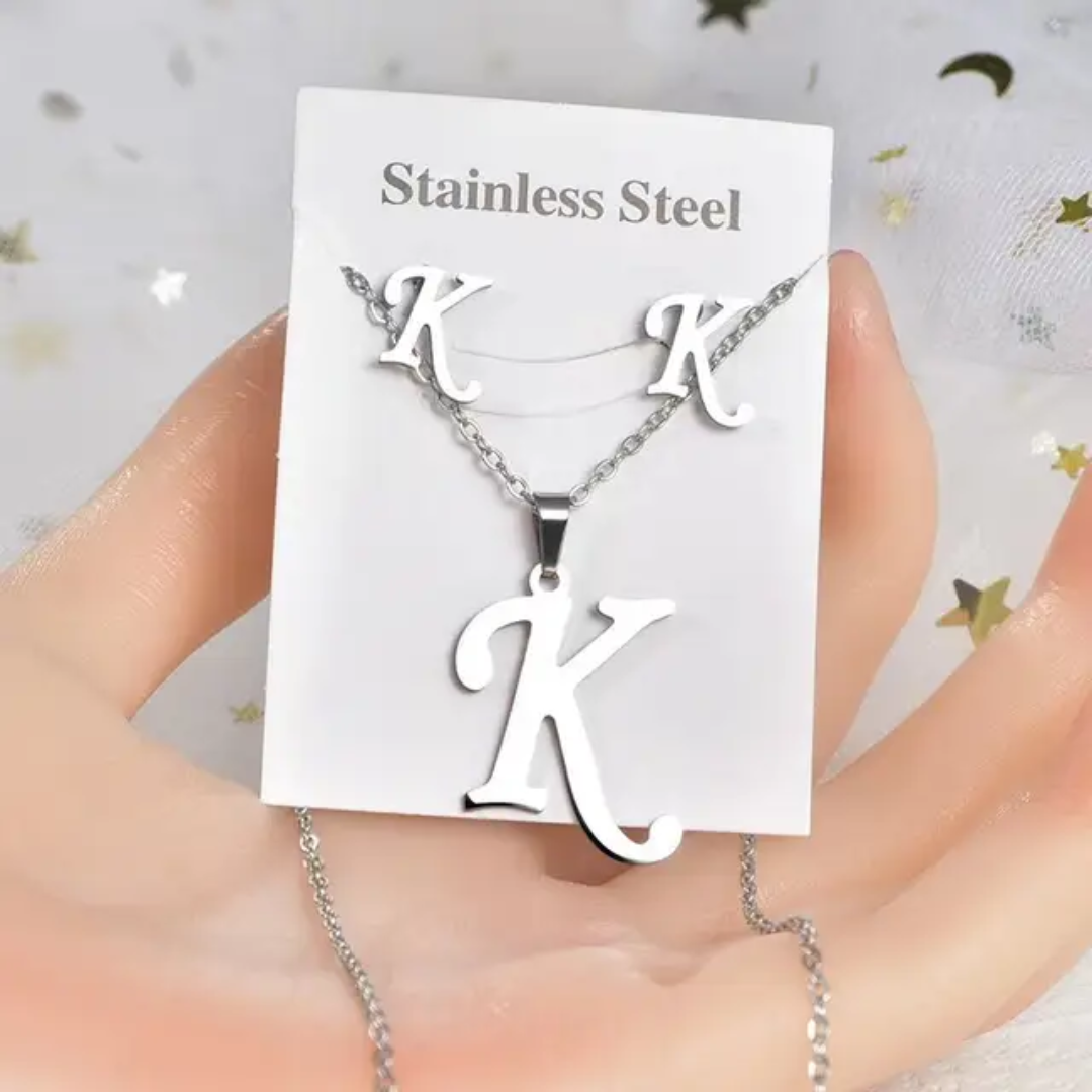 Stainless Steel 18k silver plated Alphabet pendant Necklace and Earrings