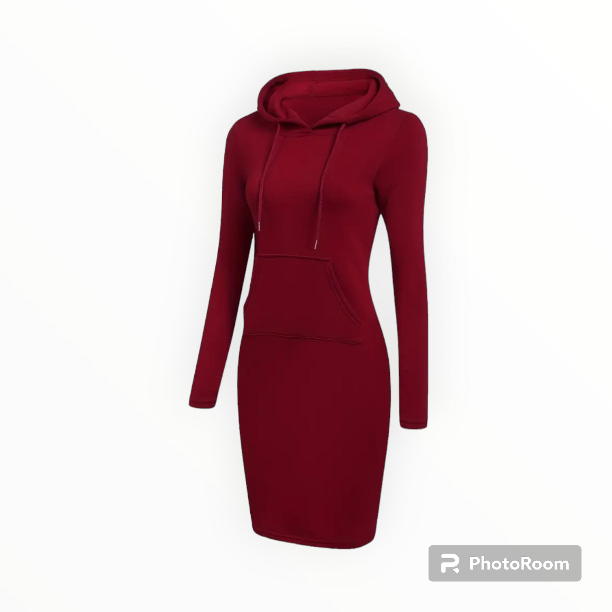 Women longs sleeve burgandy Kangaroos Hoodie sweatshirt dress with drawstring and double front pockets
